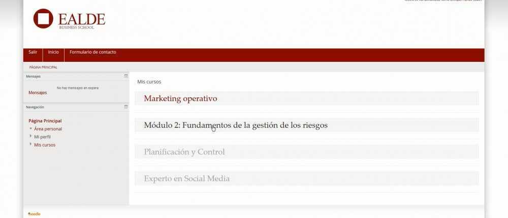 El campus virtual de EALDE se compone de un área personal y de los módulos de cada curso. Estos se van abriendo conforme el curso avanza, dando acceso de manera gradual a los alumnos. El acceso al campus virtual no tiene límite horario y se puede realizar en cualquier momento.